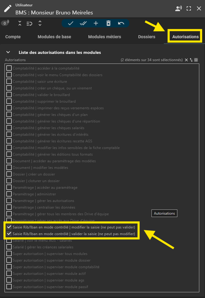 Seuls les profils disposant explicitement des deux autorisations peuvent intervenir après validation, généralement pour corriger une anomalie avant paiement.