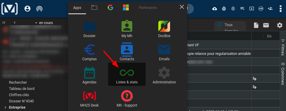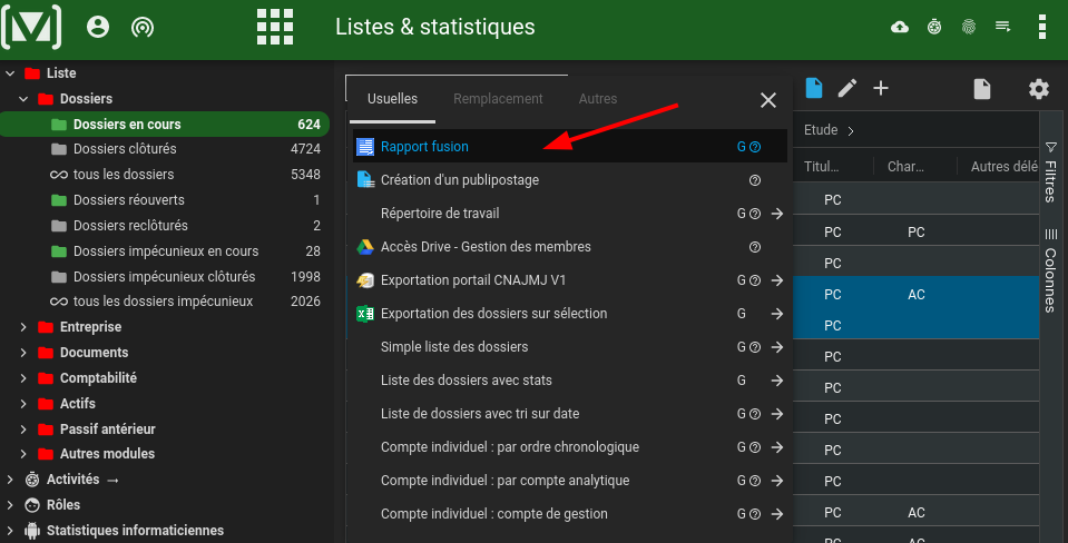 Ensuite, dans "Listes et stats", ouvrez l'arbre à gauche pour aller dans Liste / Dossiers / Dossiers en cours.